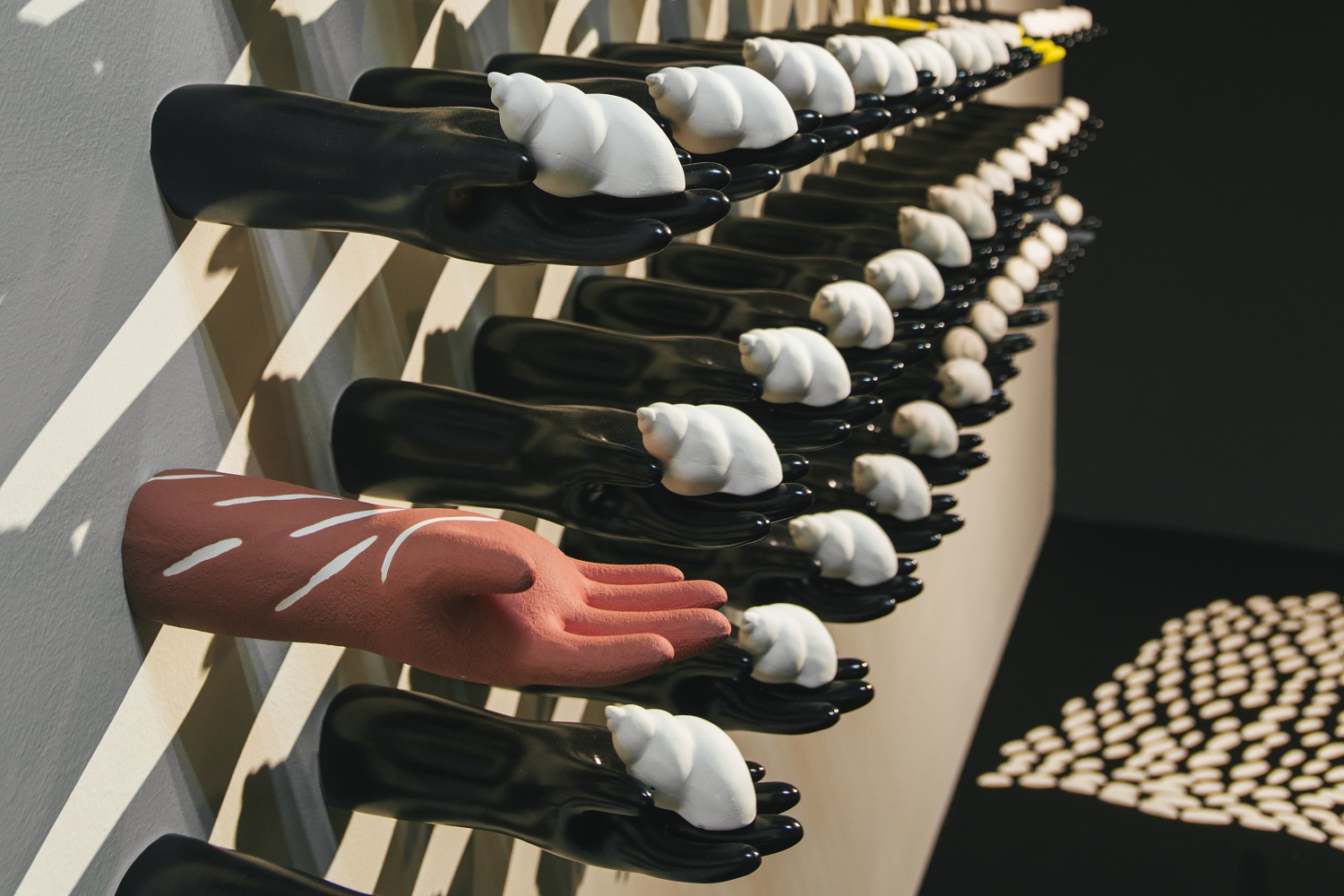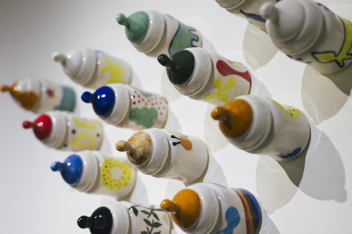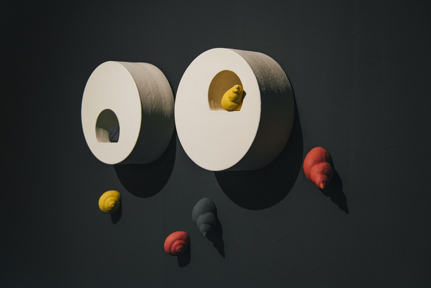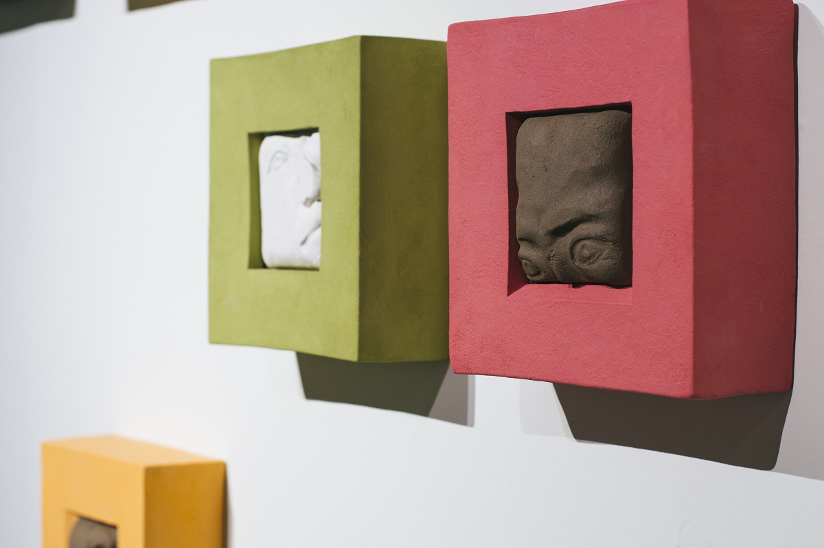 A Journey of the Soul is Fu-chi Shih’s first solo exhibition at MOCA Studio. The exhibition integrates traditional ceramic techniques, aesthetics of modern art and issues of contemporary artistic creation. The Chinese word, “xian,” means “a prescribed area” or “a limited realm.” This exhibition refers to all kinds of confinement related to time and space in human life; it represents that, within an invisible framework, when facing stress, people would make different choices and come up with various coping mechanisms, which create dissimilar landscapes in vision and in the frame of mind. Through the making of art, Shih has transformed into artworks his feelings stimulated by the restrictions in life and those of the environment, rendering these works a form of personal notes, interpretations and reexamination of his life. Shih’s creative motivation originates from the experiences and changes in his family life. Therefore, in this exhibition, he has displayed Reflection Series: the concept of “home” as well as the recognition and the sense of security symbolized by the “family members” in the first gallery. Entering the room, one will see first a ceramic wall installation, entitled Tales of Life II, which integrates the images of feeding bottles and children’s colorful brushes, demonstrating the artist’s happiness of being a first-time father with a lively, joyous tone. The following principal works: one is a wall installation, Self-viewing, which consists of 25 square pottery sculptures, individually showing a face with crushed features—a piece that explores the environment’s domination of the inner realm. The other work is a set that includes Surface I and Surface III, which are three-dimensional pottery head sculptures. Similar to writing diary entries or jotting down some thoughts in life, Reflection Series marks the artist’s inner fluctuations resulting from the changes in the exterior environment or lifestyle. Room of Oppression Series in the second gallery is primarily comprised of two wall installations and one large spatial installation. These three works all employ the unique forms and symbols of “slugs” and “snail shells.” In the installation, Meals, ceramic slugs in various sizes attach to celadon porcelain plates in small groups, turning themselves into “meals on the plates” while implying the suffering and struggle of people that cannot afford to buy houses. Manipulation I is a work that combines all kinds of human hands in black and vivid colors, staging a large-scale pantomime about disadvantaged individuals manipulated by real estate speculators. The largest spatial installation, Searching, makes use of hundreds of small white slugs clustering on a gigantic black, skyscraper-like square column. The scene of contrast and the theatrical intensity seem to epitomize all the mass movements in recent years. This series embodies the artist’s emotional fluctuations and anxieties coming from the need of searching for a house and settling down after getting married and having a baby as a full-grown adult in the society. As a matter of fact, the cynical view on this world embedded in these works has transformed and expanded from the expression of personal feelings to a kind of social critique. A Journey of the Soul—Solo Exhibition by Fu-chi Shih embodies the artist’s creative concept as well as expressive method to use objects as metaphors. While voicing and releasing his personal feelings, it also provides an outlet for the agitation and stirring emotion of the public.