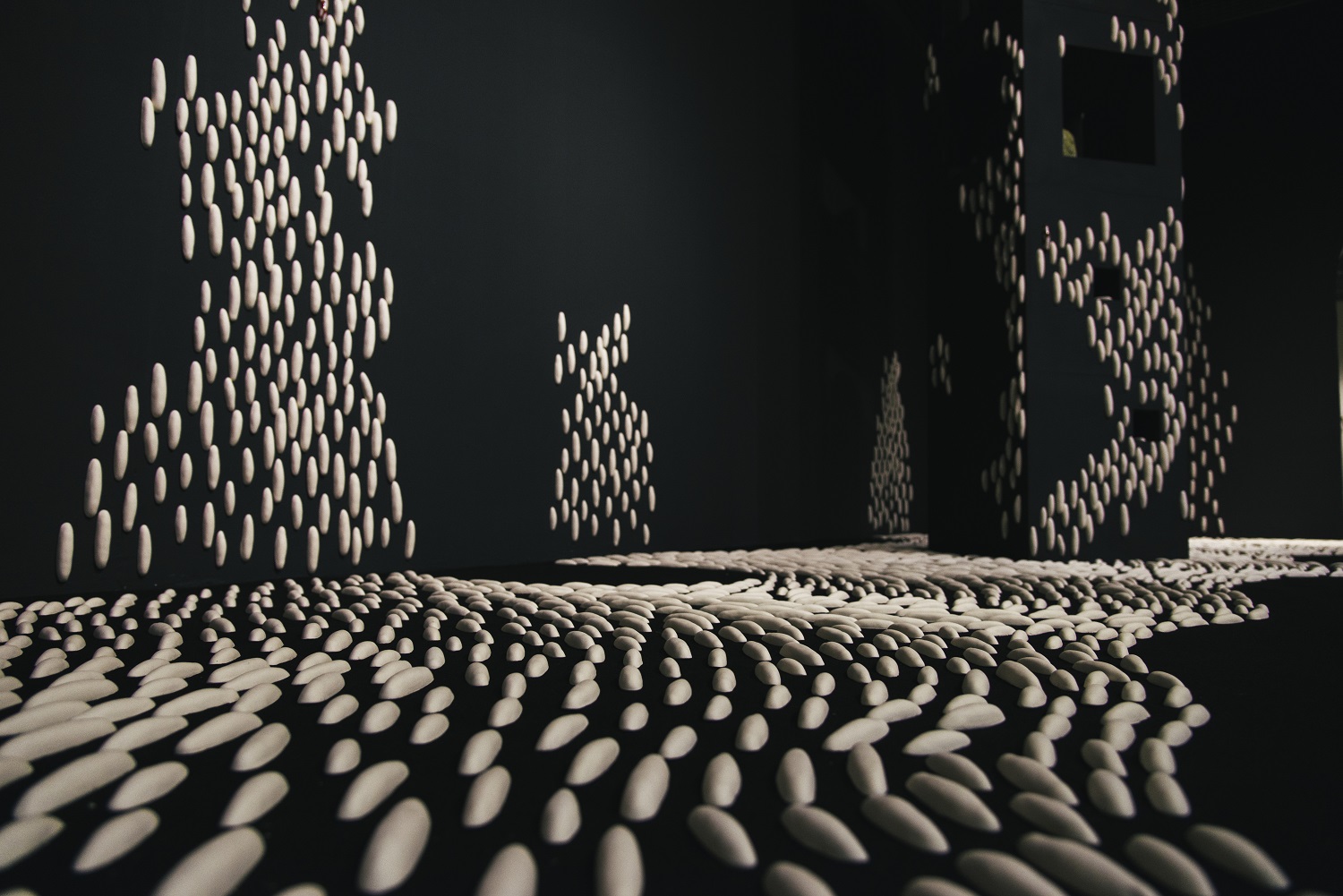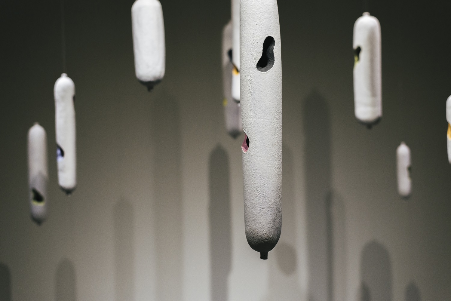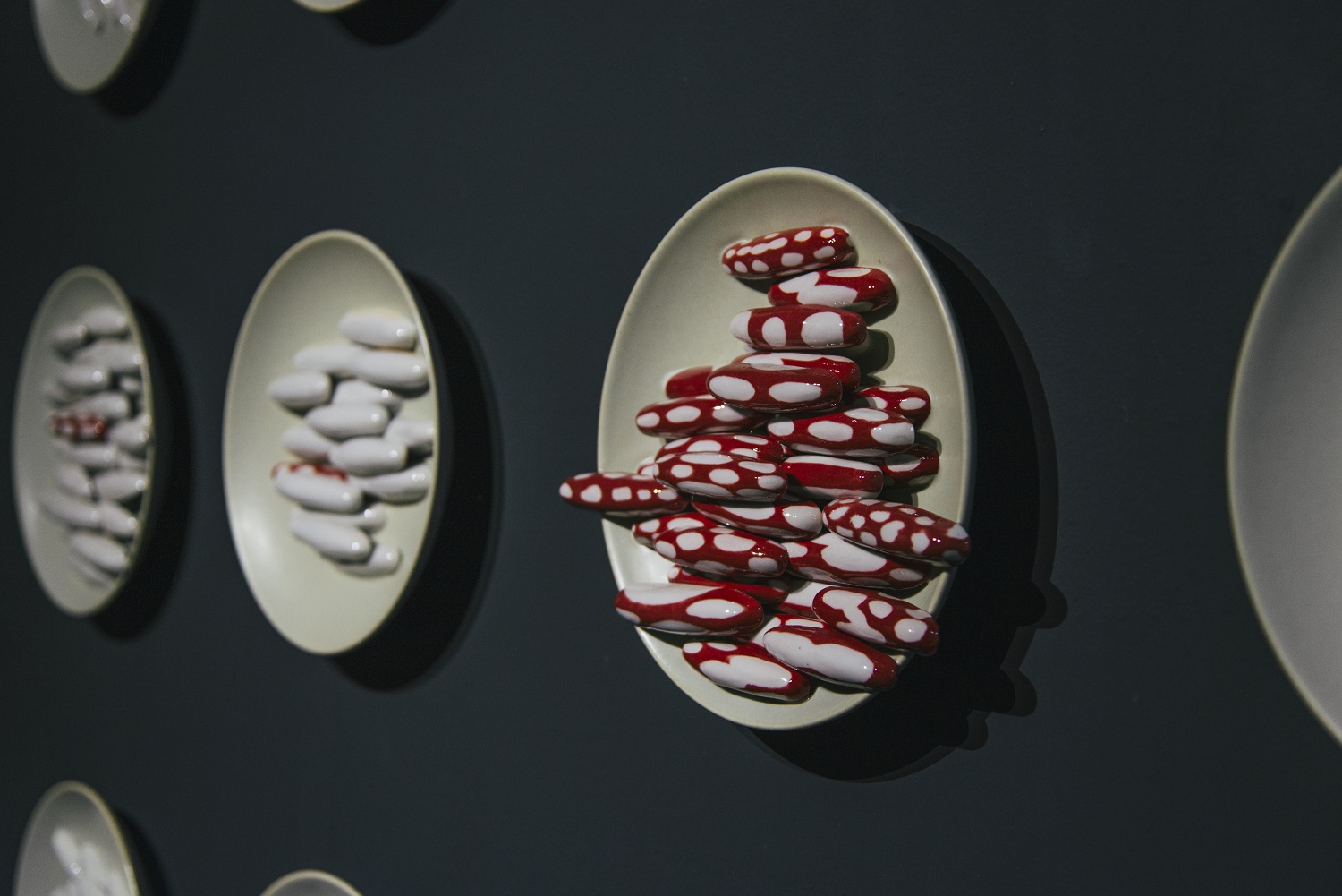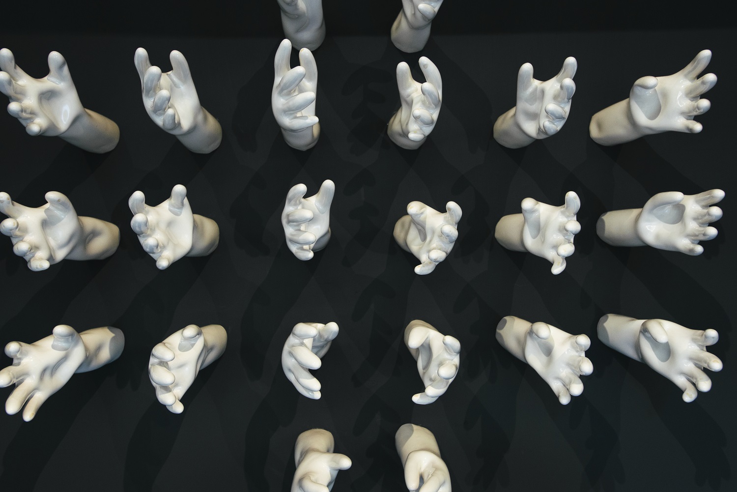 A Journey of the Soul is Fu-chi Shih’s first solo exhibition at MOCA Studio. The exhibition integrates traditional ceramic techniques, aesthetics of modern art and issues of contemporary artistic creation. The Chinese word, “xian,” means “a prescribed area” or “a limited realm.” This exhibition refers to all kinds of confinement related to time and space in human life; it represents that, within an invisible framework, when facing stress, people would make different choices and come up with various coping mechanisms, which create dissimilar landscapes in vision and in the frame of mind. Through the making of art, Shih has transformed into artworks his feelings stimulated by the restrictions in life and those of the environment, rendering these works a form of personal notes, interpretations and reexamination of his life. Shih’s creative motivation originates from the experiences and changes in his family life. Therefore, in this exhibition, he has displayed Reflection Series: the concept of “home” as well as the recognition and the sense of security symbolized by the “family members” in the first gallery. Entering the room, one will see first a ceramic wall installation, entitled Tales of Life II, which integrates the images of feeding bottles and children’s colorful brushes, demonstrating the artist’s happiness of being a first-time father with a lively, joyous tone. The following principal works: one is a wall installation, Self-viewing, which consists of 25 square pottery sculptures, individually showing a face with crushed features—a piece that explores the environment’s domination of the inner realm. The other work is a set that includes Surface I and Surface III, which are three-dimensional pottery head sculptures. Similar to writing diary entries or jotting down some thoughts in life, Reflection Series marks the artist’s inner fluctuations resulting from the changes in the exterior environment or lifestyle. Room of Oppression Series in the second gallery is primarily comprised of two wall installations and one large spatial installation. These three works all employ the unique forms and symbols of “slugs” and “snail shells.” In the installation, Meals, ceramic slugs in various sizes attach to celadon porcelain plates in small groups, turning themselves into “meals on the plates” while implying the suffering and struggle of people that cannot afford to buy houses. Manipulation I is a work that combines all kinds of human hands in black and vivid colors, staging a large-scale pantomime about disadvantaged individuals manipulated by real estate speculators. The largest spatial installation, Searching, makes use of hundreds of small white slugs clustering on a gigantic black, skyscraper-like square column. The scene of contrast and the theatrical intensity seem to epitomize all the mass movements in recent years. This series embodies the artist’s emotional fluctuations and anxieties coming from the need of searching for a house and settling down after getting married and having a baby as a full-grown adult in the society. As a matter of fact, the cynical view on this world embedded in these works has transformed and expanded from the expression of personal feelings to a kind of social critique. A Journey of the Soul—Solo Exhibition by Fu-chi Shih embodies the artist’s creative concept as well as expressive method to use objects as metaphors. While voicing and releasing his personal feelings, it also provides an outlet for the agitation and stirring emotion of the public.