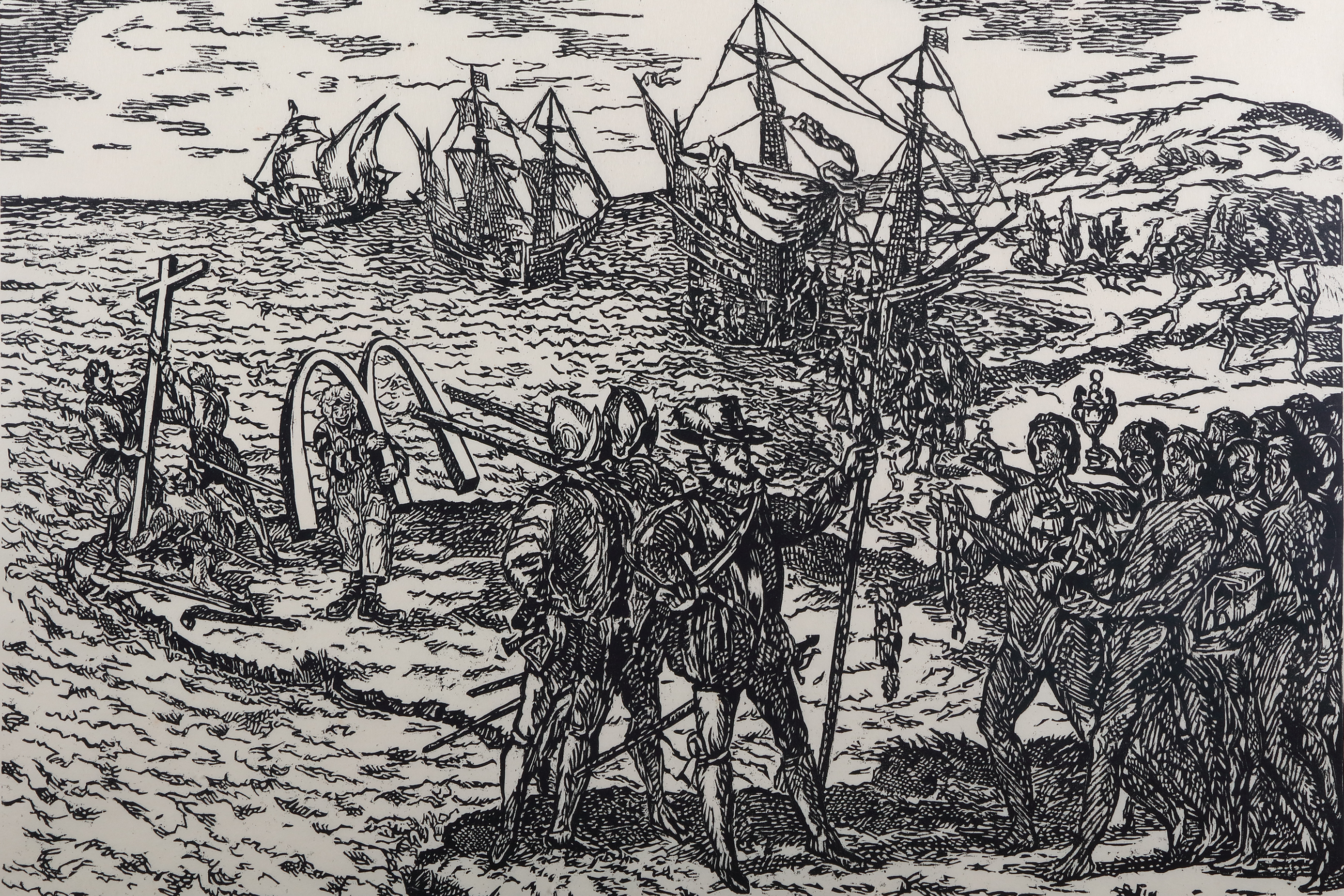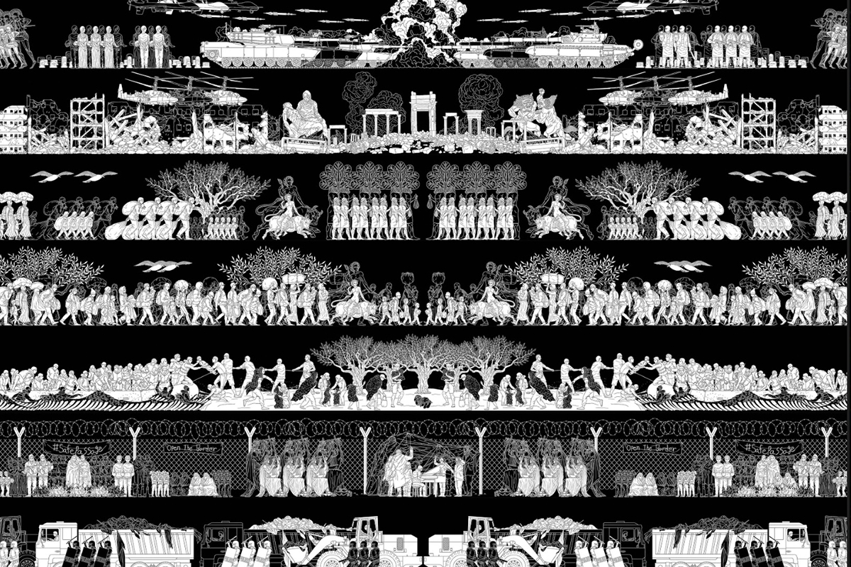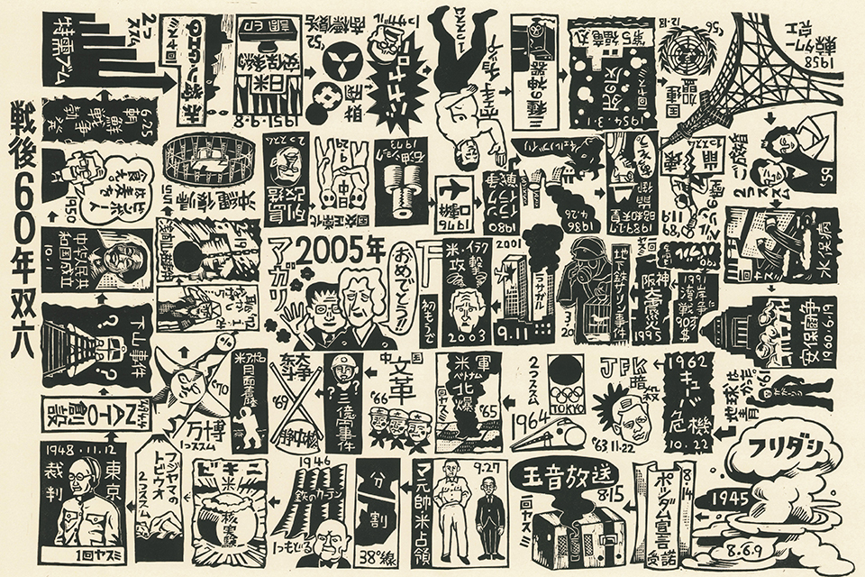 Born in Tokyo, Japan in 1972, Sachiko Kazama has adored ukiyo-e since she was young. She graduated from the Department of Printmaking, Musashino Art University in 1996. Her artistic style is deeply influenced by modernist prints from the Taisho Era, and her work adopts a formal language that integrates woodcut prints and cartoon-like figures to reflect current events, phenomena and their origins, through which she re-examines and discusses the past while posing her question by asking, “is history authentic?” By doing so, she incorporates extensive literature studies, field visits and research about historical context to connect the past and the present and create collage-like narratives comprised of fictional and realistic elements to highlight the historical absurdities. According to the artist, “uncovering the historical memories that have faded and envisioning the future from a corner of a peaceful city have become my creative method.” Her objective is not to create any political impact or alteration, but rather cultivate the audience’s critical thinking, using art as her medium. Kazama was the recipient of the Superior Prize in the 9th Taro Okamoto Award for Contemporary Art in 2006 and the 8th Tradition Créatrice Art Award presented by the Japan Arts Foundation in 2016.