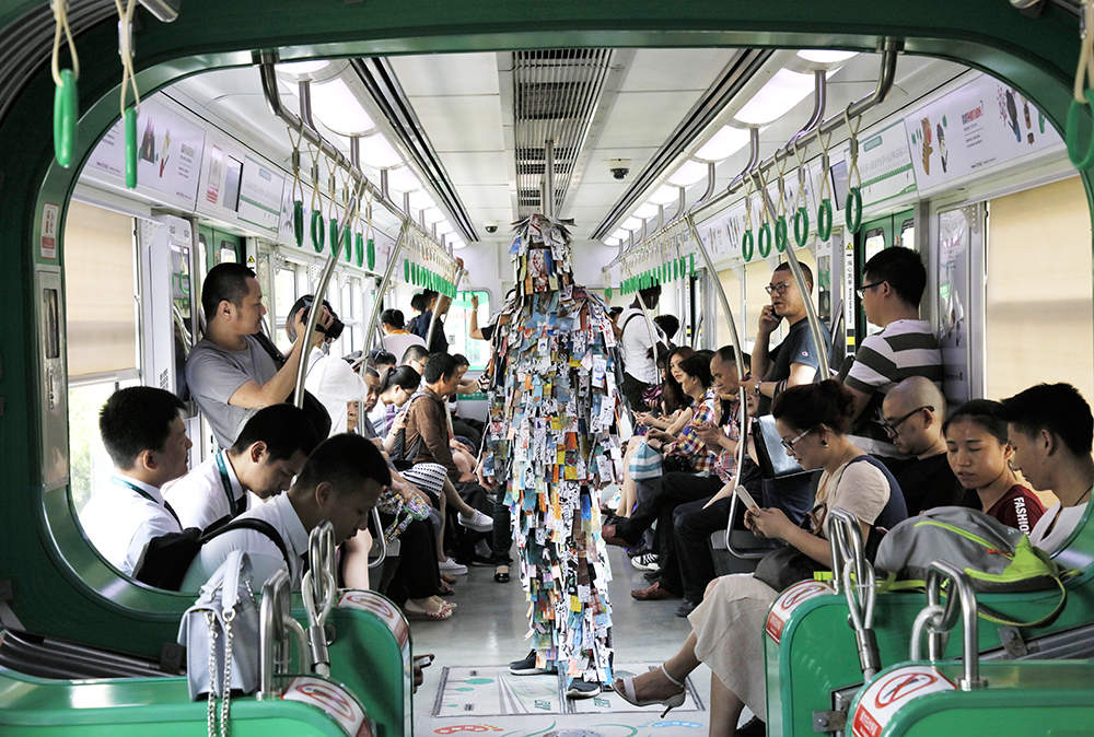 #Tagman shows an opposite approach from Live Protraits. Instead of interacting with the audience before drawing, Park cuts his art works into 9 x 4 cm small cards, tags the cards onto his jumpsuit (the artist mocks that he looks like a yeti), and walks onto the bustling streets. People are welcome to take a label off from him. The images on the labels are drawn from people on the streets, and through further exchange with others, narratives are written in perpetual interchange.