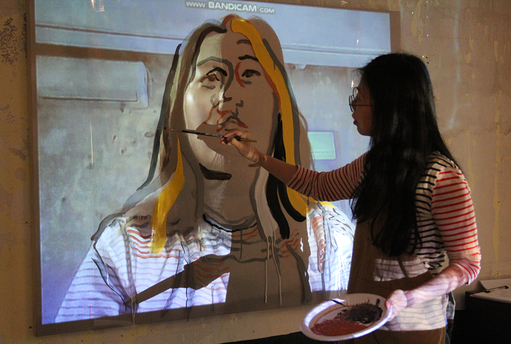 Goyona Jung’s paintings are composed of daily life, such as a car wash parking lot, a softly lit window sill in a dark night... The style is often realistic, with simple, flat strokes, while the acrylic paint is mixed with black, grey or white, showing a tint of melancholy. In contrast to a personal perspective or expression, the series Live Portraits showcases a different style. Jung first invites participants who are willing to speak with her one-on-one, and films the participant’s face while seated opposite. A transparent acrylic panel is installed on the wall, and the artist projects the participants’ videos on the wall, sketching the contours of his or her face, and replacing the panel to sketch the face of another participant, later installing the acrylic panels as one large installation. The color in this work is much brighter, with unmixed acrylic paint, vibrant lines of faces layered on top of each other, as if a brilliant flower in bloom, layer upon layer of blossoming narratives.