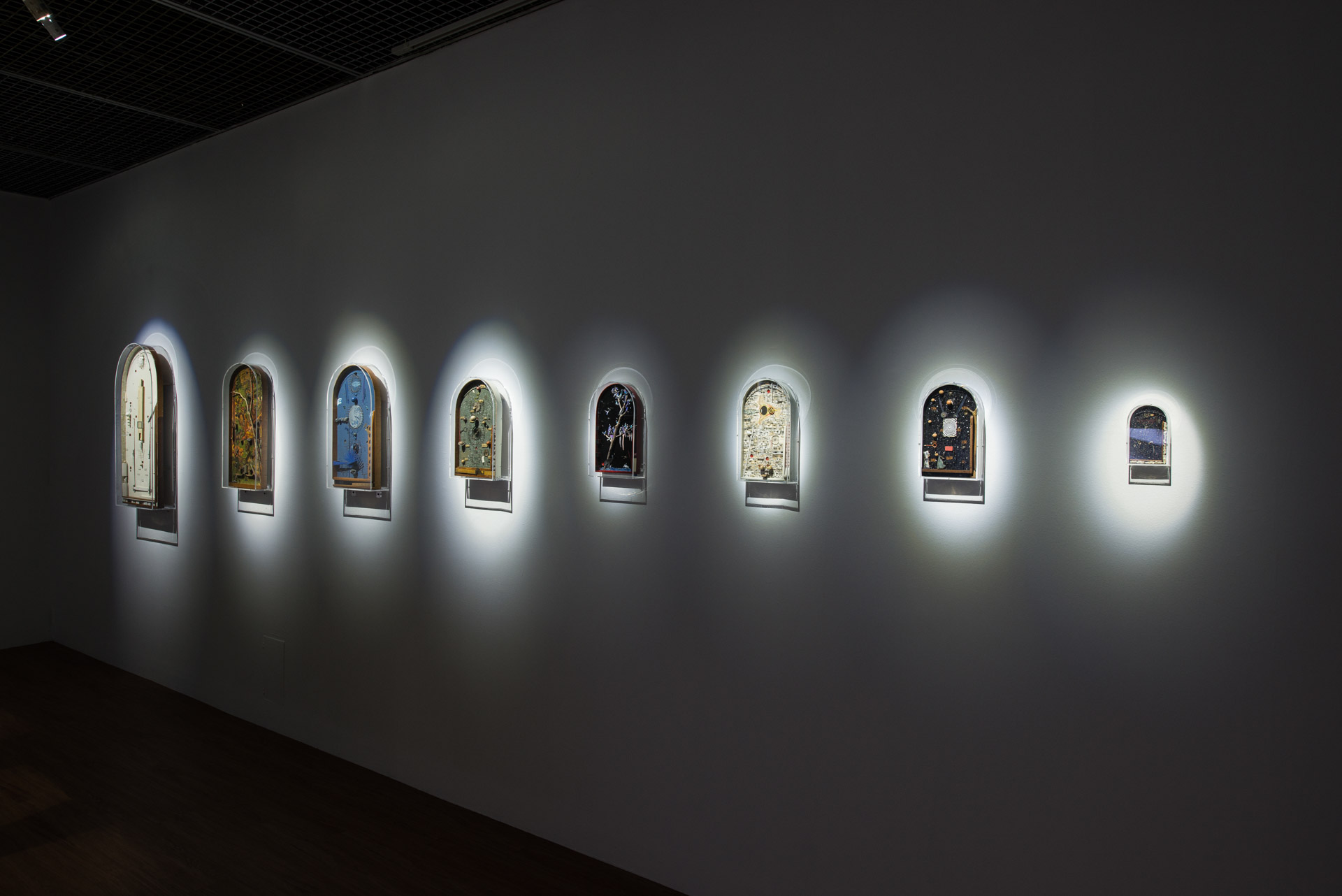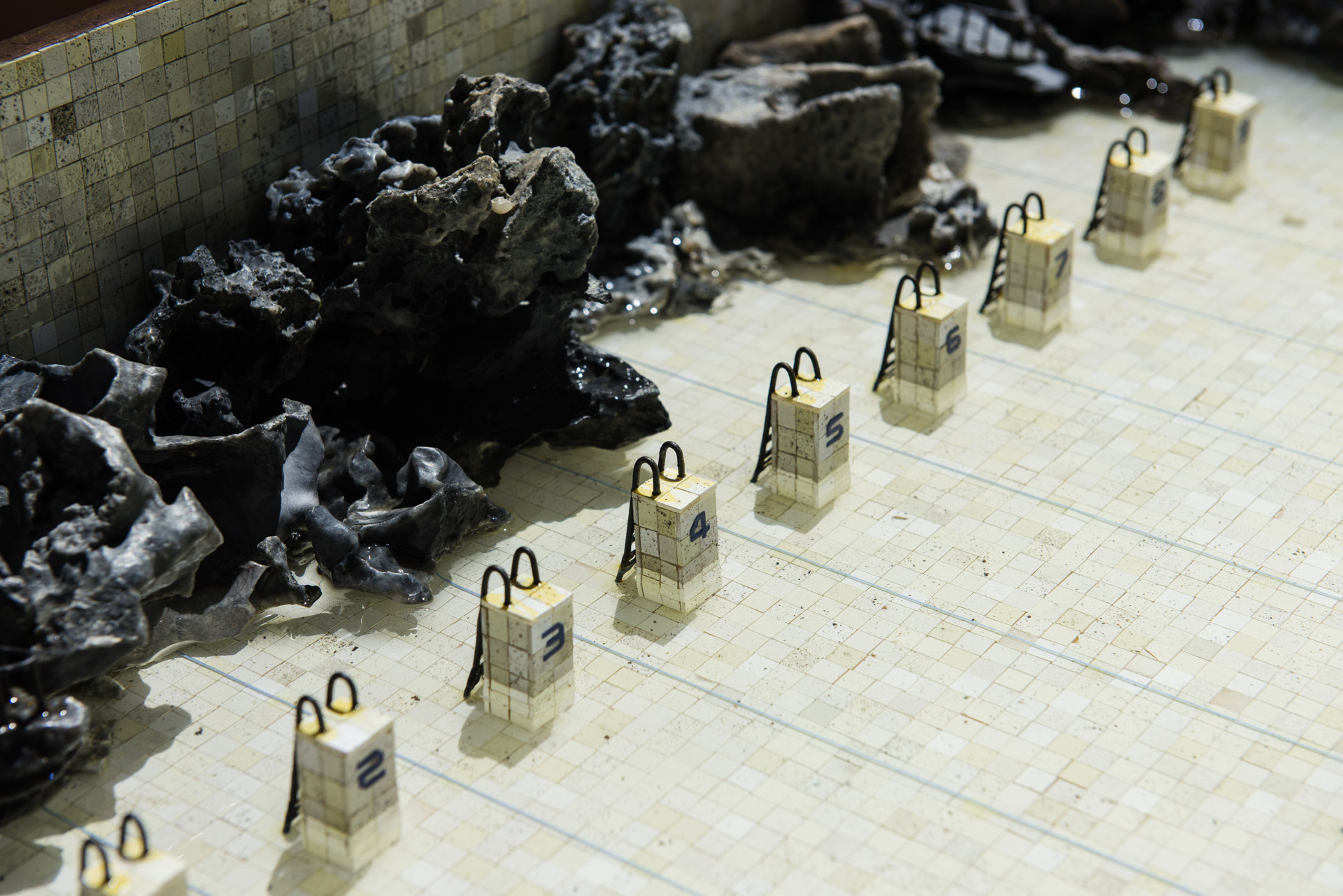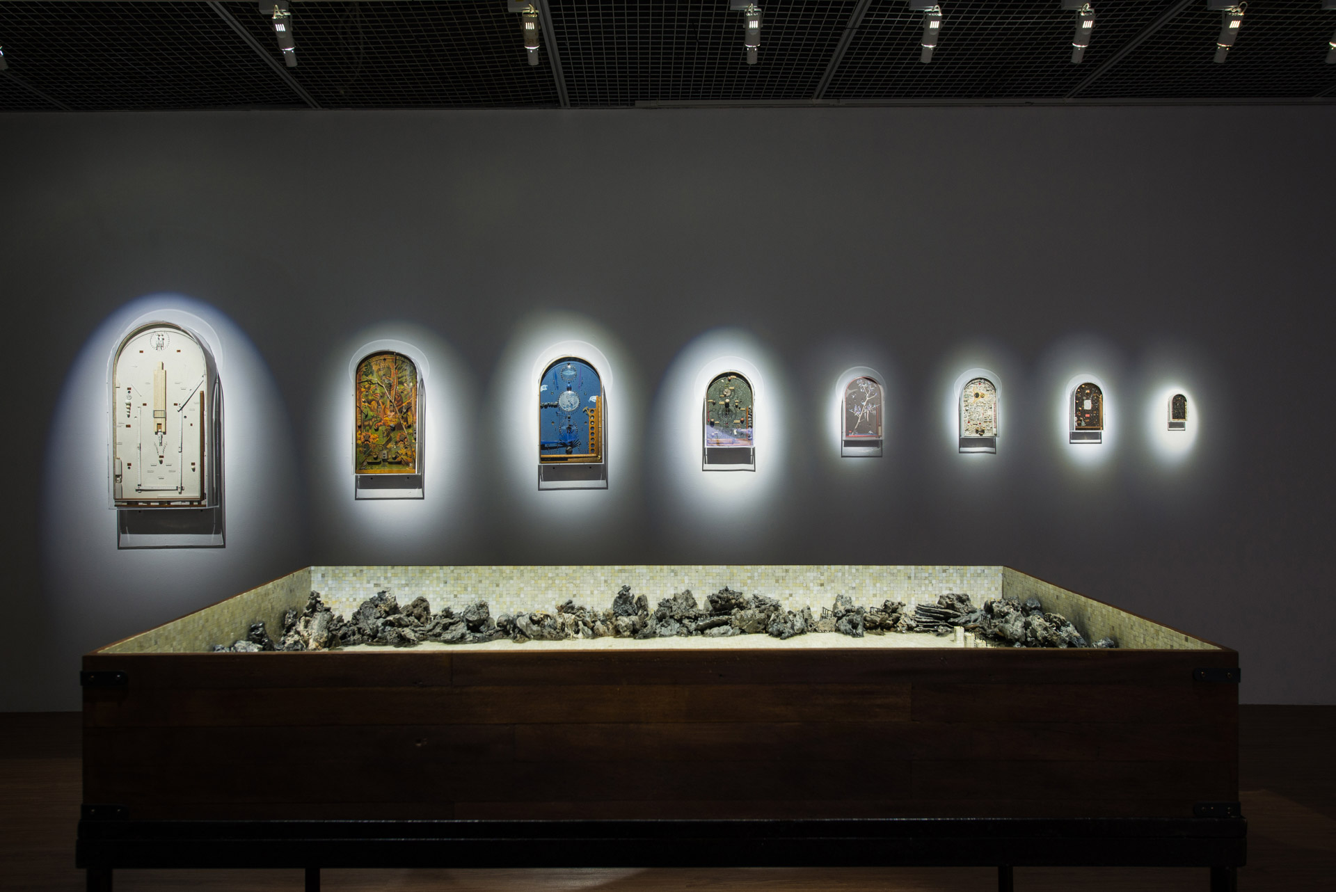 Ni Youyu was born in Ganzhou, Jiangxi, China in 1984. He graduated from the Fine Art College, Shanghai University in 2007, and was awarded "Best Young Artist" of Contemporary Chinese Art Award (CCAA), China in 2014. His artistic creation integrates Eastern and Western philosophical views and aesthetic ideals, and often centers on nature, time, and traditional culture. His subject matter ranges from the eternal universe and stars to the contemporary mundane world, incorporating his contemplation and thinking about time and space. His first solo exhibition at the MOCA, Taipei this time is a presentation of another stage after his solo exhibition at the Shanghai Art Museum in 2012. The exhibition title uses the idiom, “constant dropping wears away a stone,” which epitomizes Ni’s creative method and artistic spirit in recent years—many of his works have taken many years from the initial conception, to the preparation, and to their final completion. The procedures would inch forward little by little. Although time has seemed irrelevant in the process of making, these works are actually about time itself. In addition, the artist’s creative exploration and artistic attempts in painting, installation, sculpture, collage, and video are also showcased in the exhibition, enabling audience to have a comprehensive reading of the intricate connection between these works. Responding to the characteristic and historic architecture of the museum, Ni has specifically choreographed the exhibition and artworks according to the spatial ratio and distinctive quality of the gallery space. Freewheeling Trip at the beginning of the hallway is a panoramic natural landscape made with vintage black-and-white images, guiding audience’s temporal and spatial imagination in their movement through the exhibition. Shrine Series in R103 transforms wooden pinball machines collected from all over the world and converts them into still objects that are infused with a sense of sci-fi amusement or religious mysteriousness. Dust in R102 is a drawing of the starry sky on a blackboard, offering audience an opportunity to appreciate and experience the infinite beauty of the universe from a tiny classroom. Garden Pool is a combination of a rock garden and a pool, attempting to integrate ancient Chinese rock garden with familiar swimming pool design. It makes people feel like being in a tranquil, relaxed microscopic world. Pagoda II piles up unfinished lotus seats to imitate a pagoda building whereas Inches of Time is a work that presents variations of measurement predetermined by subjective perception. These installations are metaphoric instances that demonstrate how the artist has traversed and bridged the history and contemporary spirit while conveying symbolic meanings.