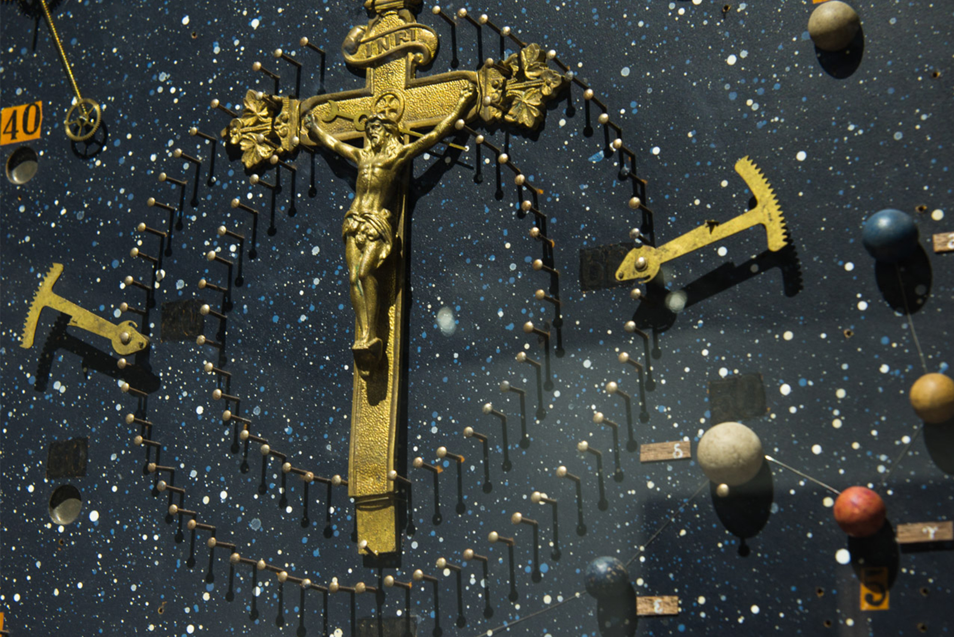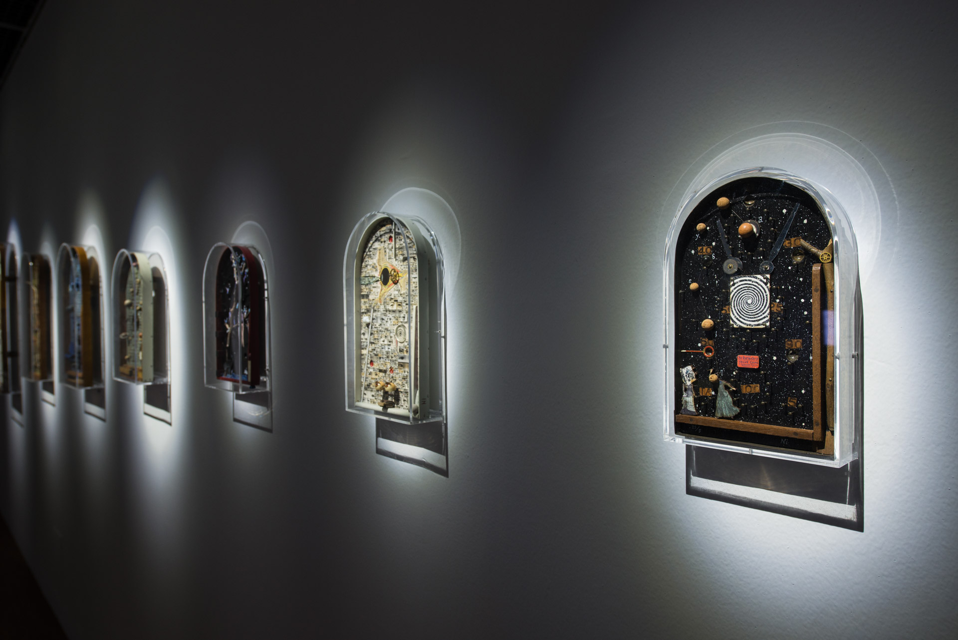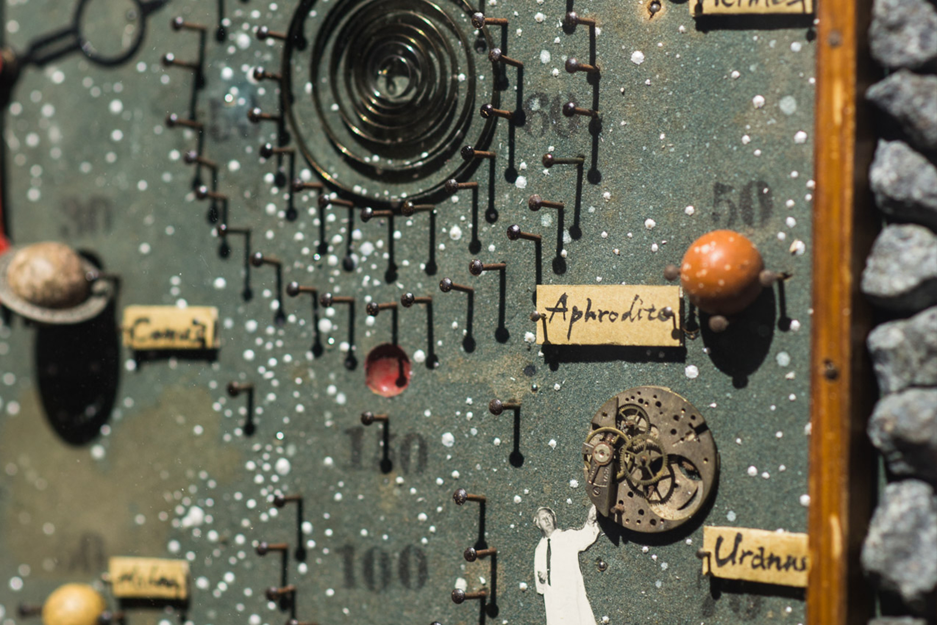 Ni Youyu was born in Ganzhou, Jiangxi, China in 1984. He graduated from the Fine Art College, Shanghai University in 2007, and was awarded "Best Young Artist" of Contemporary Chinese Art Award (CCAA), China in 2014. His artistic creation integrates Eastern and Western philosophical views and aesthetic ideals, and often centers on nature, time, and traditional culture. His subject matter ranges from the eternal universe and stars to the contemporary mundane world, incorporating his contemplation and thinking about time and space. His first solo exhibition at the MOCA, Taipei this time is a presentation of another stage after his solo exhibition at the Shanghai Art Museum in 2012. The exhibition title uses the idiom, “constant dropping wears away a stone,” which epitomizes Ni’s creative method and artistic spirit in recent years—many of his works have taken many years from the initial conception, to the preparation, and to their final completion. The procedures would inch forward little by little. Although time has seemed irrelevant in the process of making, these works are actually about time itself. In addition, the artist’s creative exploration and artistic attempts in painting, installation, sculpture, collage, and video are also showcased in the exhibition, enabling audience to have a comprehensive reading of the intricate connection between these works. Responding to the characteristic and historic architecture of the museum, Ni has specifically choreographed the exhibition and artworks according to the spatial ratio and distinctive quality of the gallery space. Freewheeling Trip at the beginning of the hallway is a panoramic natural landscape made with vintage black-and-white images, guiding audience’s temporal and spatial imagination in their movement through the exhibition. Shrine Series in R103 transforms wooden pinball machines collected from all over the world and converts them into still objects that are infused with a sense of sci-fi amusement or religious mysteriousness. Dust in R102 is a drawing of the starry sky on a blackboard, offering audience an opportunity to appreciate and experience the infinite beauty of the universe from a tiny classroom. Garden Pool is a combination of a rock garden and a pool, attempting to integrate ancient Chinese rock garden with familiar swimming pool design. It makes people feel like being in a tranquil, relaxed microscopic world. Pagoda II piles up unfinished lotus seats to imitate a pagoda building whereas Inches of Time is a work that presents variations of measurement predetermined by subjective perception. These installations are metaphoric instances that demonstrate how the artist has traversed and bridged the history and contemporary spirit while conveying symbolic meanings.