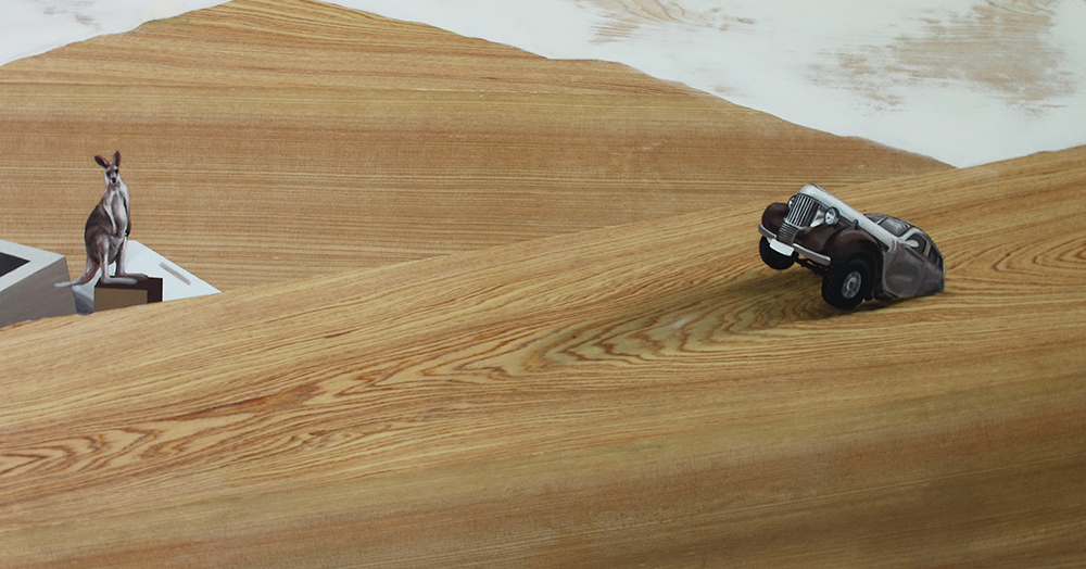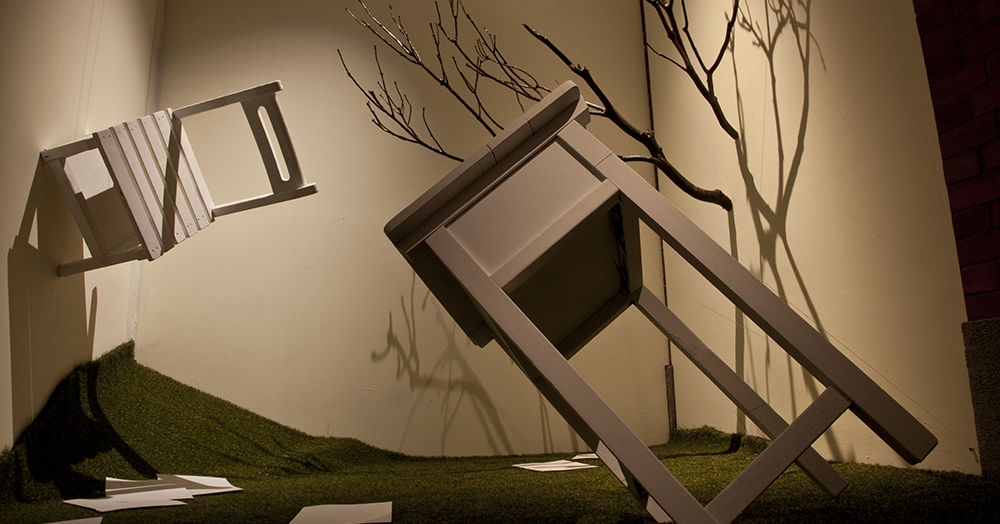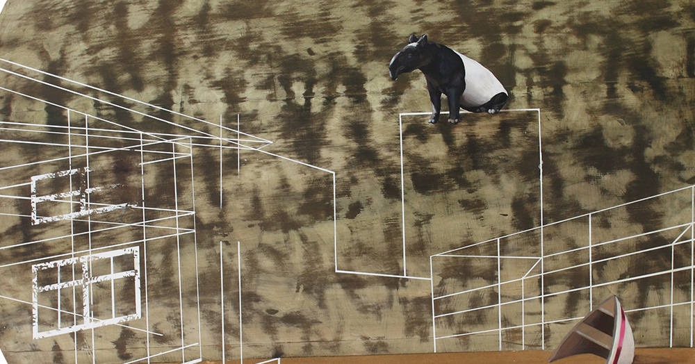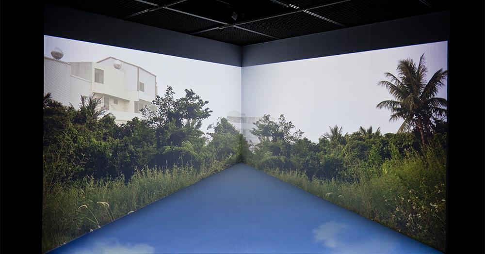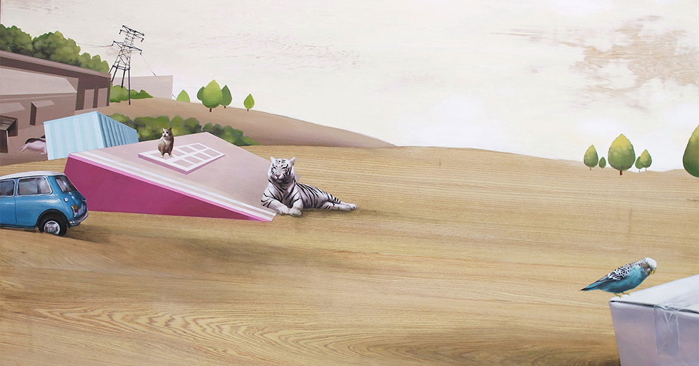 Tseng Sheng Hui, a young Taiwanese artist from Tainan, won the Honorable Mention of the Taipei Arts Award, Kaohsiung Arts Award, and Taoyuan Creation Award all in 2010 with her exquisite paintings. She has held solo exhibitions and joined in many group exhibitions in recent years. Tseng’s works convey the feelings and self-remarks of her generation through unique visual language. Tseng’s solo exhibition at MOCA Studio presents six stylistic paintings in the first exhibition room. They are inspired by personal experience and observation on life. Tseng excels in combining the wooden pattern and painting. In her works, she makes use of events, information and images in news reports, and constructs the symbols such as animals and oblique, sunken cars and houses into a wilderness with surrealistic visual language, transforming and sharing her detached observation of the external reality as well as her contemplation and imagination Comparing to the vastness in the works in the first room, the spatial installations comprised of video and other objects in the second room deliberately starts from the ground in a corner and expands into another form of spatial, visual experience. The video installation on three walls shows projection of clouds overlapping with images of urban space and countryside surfacing in sequence and replacing each other. It explores issues about our society and civilization, in which urban development and construction cause the disappearance of nature. The installation on another corner combines a video work and objects found in our daily life and offices. It allows the viewers to feel the gaps in time and perception caused by social development by mixing feelings and images that resembles post-apocalyptic ruins at sunset. The exhibition adopts reversed thinking in contemplating on the rupture of nature caused by urban development, and discusses the construction of civilization and the phenomenon of infinitely multiplying, crutch-like 3C products. It could be seen as a poetic journey from an image world to a spatial realm of unique experiences.