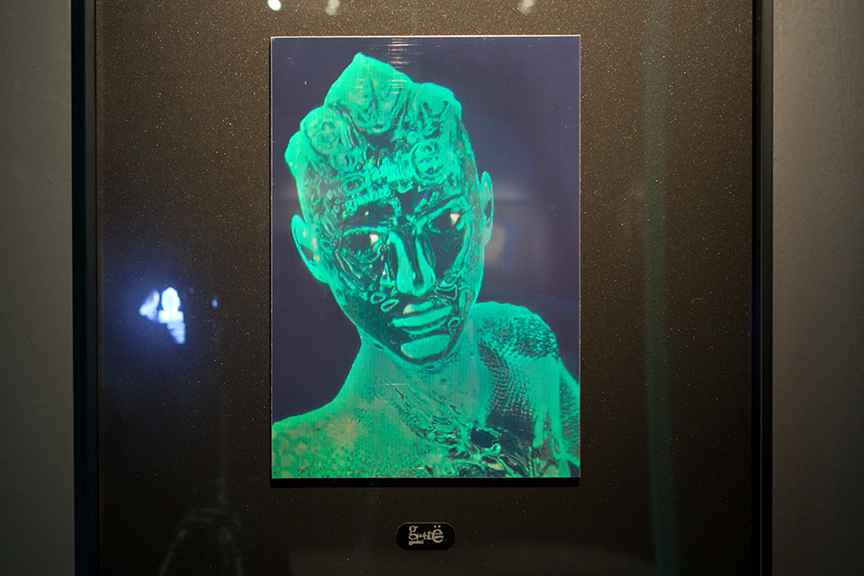 The work “Portrait of Eve Clone” will be presented in 3D hologram format framed in acrylic board. On the forehead of Eve Clone, the beast number 666 is marked in Chinese, Arabic, Egyptian, and etc. Through the frame, Eve Clone looks like a specimen, however, when people comes closer and walks around her, her eyes would follow their direction which makes Eve look alive. The artist would like to expose the tension between Organic Nature and Inorganic Technology through this work.