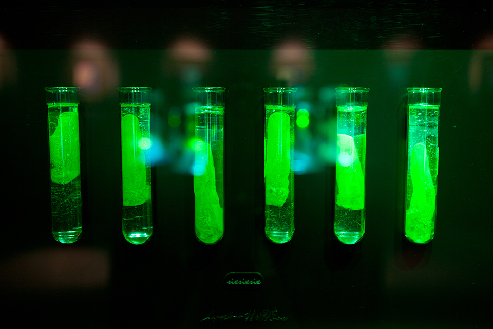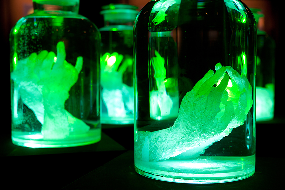 The Bible not only states that the beast number would be marked on the forehead but also on the right hand. So, the artist presents a sculpture “The Hands of Eve Clone” and stores it in a medical glass container, allowing it to look like a formaldehyde specimen located in a chemistry lab.
