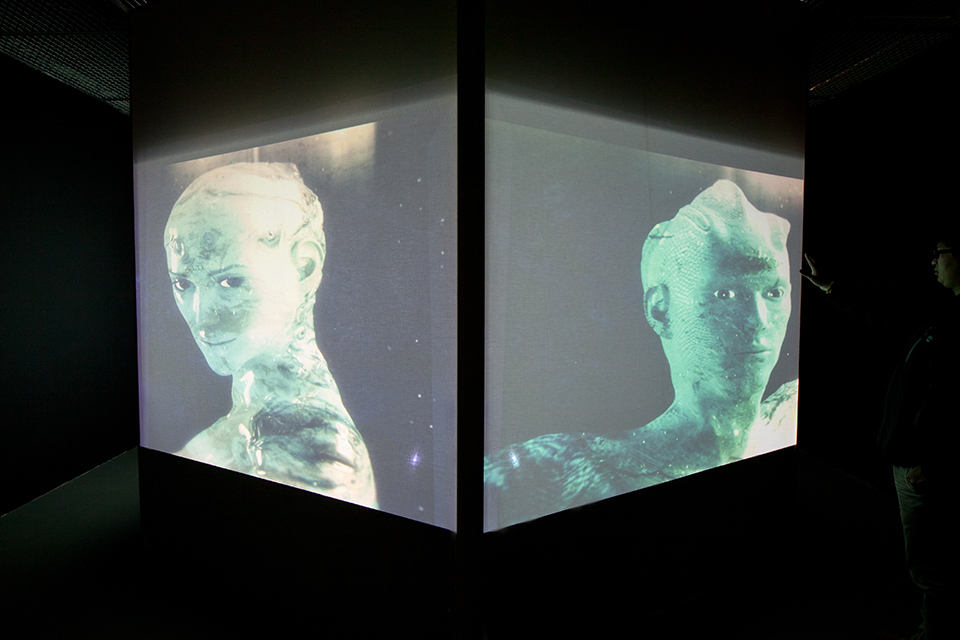 The other project, an interactive installation, “Eve Clone No. 3”, is presented in six huge images on a hexagon installation. The faces of Eve Clone looks like she is floating in water and as audience passes by, her face and eyes will follow the direction of the audience. When people walks around the installation, the surrounding and environment turns out to be a mysterious communication between Eve and the audience. The artist hopes to stimulate people to be aware of the consequences from high technology development and behind every temporary fantasy, there lies a hidden crisis.