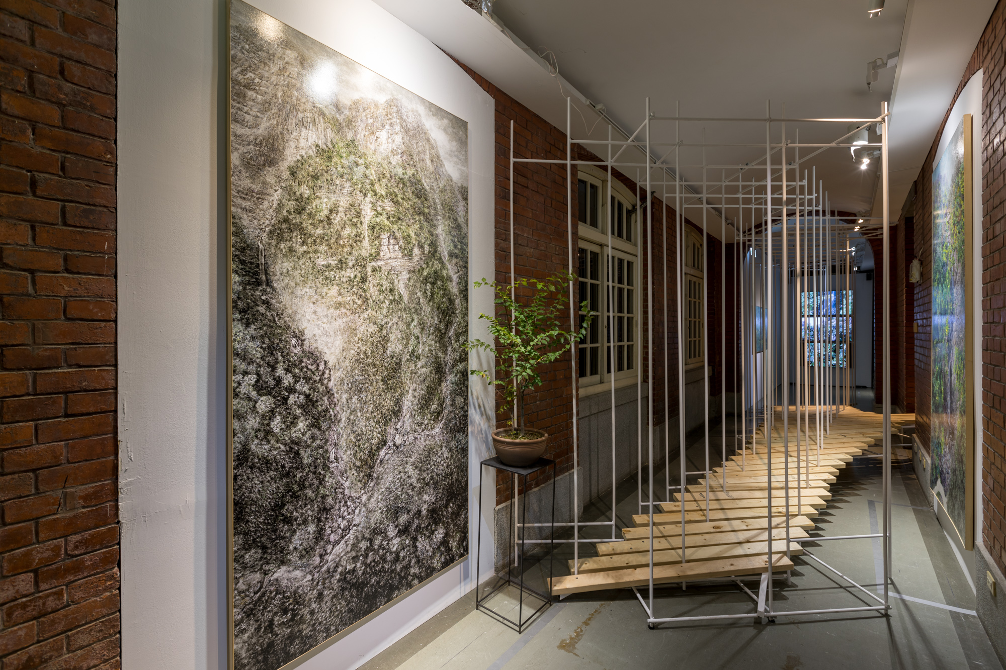 The final part of the exhibition returns to the forest scenery in Taiwan. Walking into Suspended Bridge created by CHEN Xuan-Cheng /ArchiBlur Lab, audience will see HUNG Tien-Yu's new painting, Tianshuei Waterfall at the beginning, which exudes the charm of ink painting. At the end of the bridge, another painting by HUNG, The Upstream of Chilidan Stream, greets the audience with delicate delineation of the lively and lush primitive mountains in Taiwan. Also at the end of the bridge, French artist Alice Mallet shows her video work of Photinia serratifolia filmed at Bois des Moutiers with an underscore by Norman Yamada. This particular Photinia serratifolia was transplanted in a garden in Normandy, France, and has now returned to Taiwan in the form of a video. Through this section, the exhibition reexamines the problematic of "ecolonialism" in the context of globalization while responding to the cultural thinking of recontextualization in this eco action of "returning the land to trees."