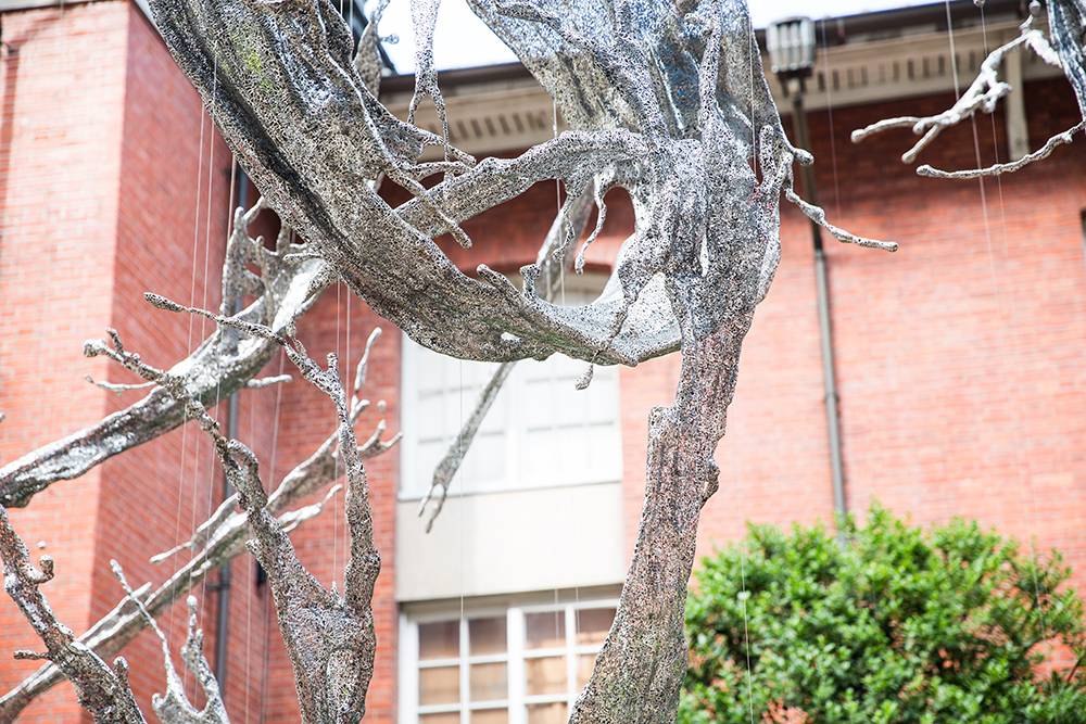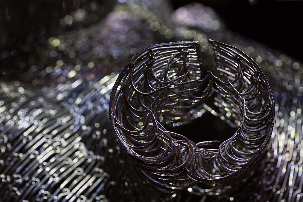 Zheng Lu was born in Chifeng, Inner Mogolian in 1978. As a child, he practiced Chinese calligraphy with his grandfather and transcribed poems and verses for his father, a literature enthusiast. Such background gave birth to Zheng’s keen interest in the forms and meanings of Chinese characters as well as the historical allusions carried by these characters. Therefore, when conducting his graduate study at China Central Academy of Fine Arts in Beijing, he started thinking about transforming the two-dimensional, symbolic forms of Chinese characters into three-dimensional sculptures and spatial installations. To create the foundation for his work, Zheng integrated hieroglyphs, metal technique of openwork carving, and visual effect of overlapping light and shadow. In terms of selecting the characters, he intentionally chose words with radicals symbolizing “water.”