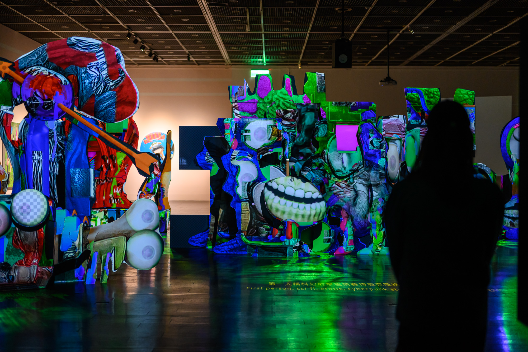 Contemporary political propaganda often assumes the forms of cultural and entertainment trends that are repeatedly broadcasted on diverse media and has further infiltrated people’s life comparing to military threats. The “AK47 Girls” in Chen Ching-Yao’s painting are depicted as pretty girls in uniform as a military army that is ready to attack their next target. Hsu Che-Yu’s Re-rupture draws inspiration from Wu Chong-Wei’s unsuccessful project proposed for the “Taipei Breaking Sky Festival” in 1995. Although Wu came up with such a project that embodied the anarchist spirit, his father was an artist who served the authoritarian regime. In Re-rupture, therefore, we seem to glimpse the relationship between two generations in the politically influenced society of the post-war Taiwan. Throughout the construction of history or civilization, those who are excluded are sacrificed or silenced—eventually, they become taboos. Li Yi-Fan’s Boring Gray utilizes a large amount of video game materials and stock image models to create a large-scale projection installation, with which he discusses the taboo of “seeing.” In many cultures, one might even be cursed upon breaching a visual taboo. In the contemporary era, the advancement of computer graphics seems to become another visual curse. As we constantly push the visual limit, we are also approaching the edge of the curse.